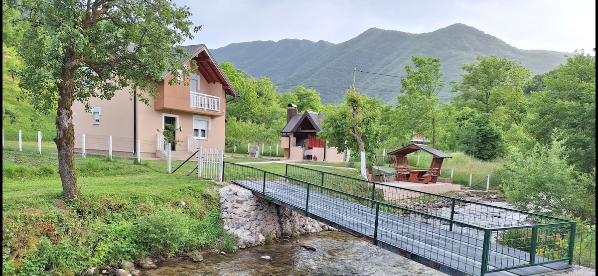 Villa for up to 11people! Located next to a river, this beautiful 4-bedroom villa offers free WiFi, free parking, a washing machine, fully equipped kitchen, as well as a terrace and a large grass picnic area with complete privacy. Staff on site can offer shuttle services. Towels and bed linen are offered in the villa. The house is in a family-friendly neighborhood, very close to Ilidža, Vrelo Bosne, Sarajevo International Airport and the centre of Sarajevo.