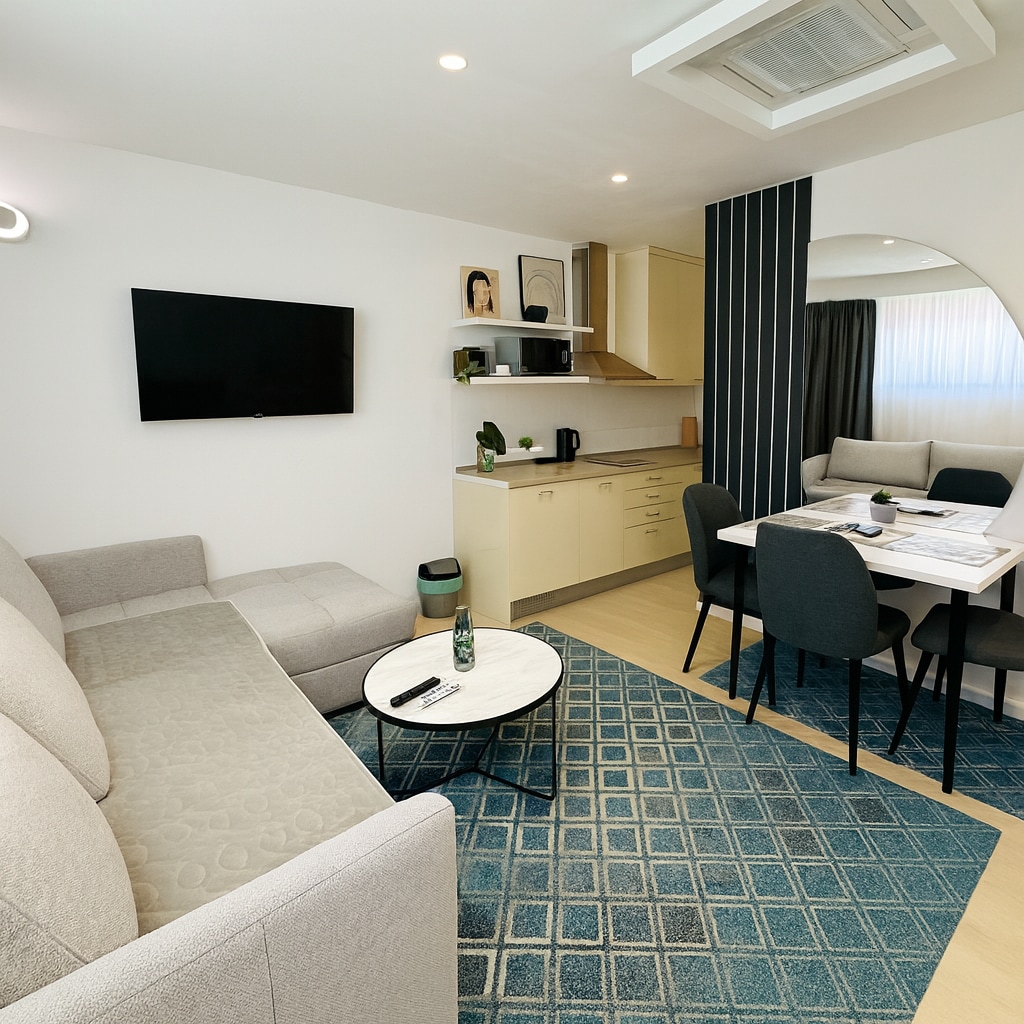 We give you the opportunity to loosen up, relax and spend your time in our beautiful spacious apartment. You're going to enjoy the atmosphere on apartment's balcony in calm neighborhood that is located at a walking distance from center and few hundred meters from tunnels and pyramids. Apartment has 2 bedrooms and extra space in living room if needed, bathroom with shower, kitchen with all equipment for preparing meals and large living room with TV.