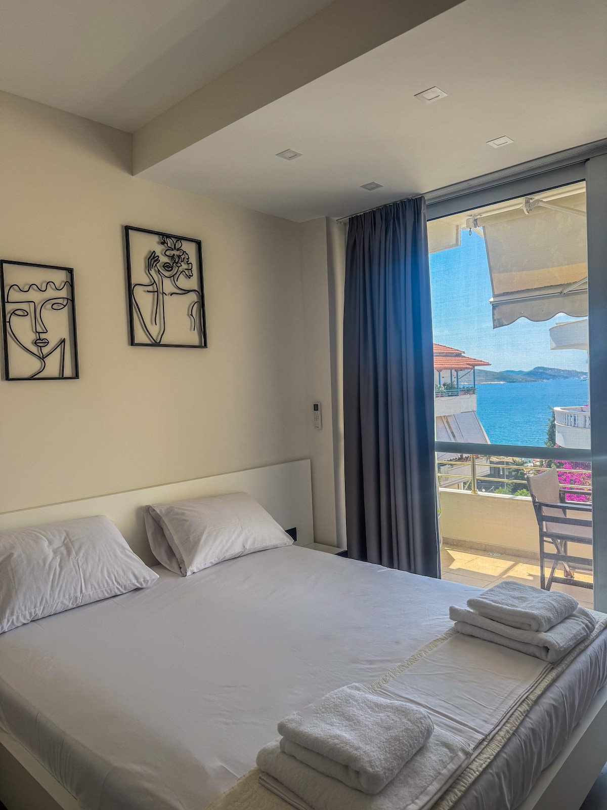 Welcome to Poseidon’s Perch in beautiful Sarandë! Come experience a newly renovated apartment with sweeping sea views. This 1 bed, 1 bath apartment takes indoor/outdoor living to a whole new level with an expansive sliding glass wall. Ample outdoor dining and lounge space will ensure you have a front row seat to spectacular sunsets. Located in an ideal area of Sarandë with beaches, restaurants, markets, and beach clubs in walking distance. Pack your swimsuits, and we’ll see you soon!