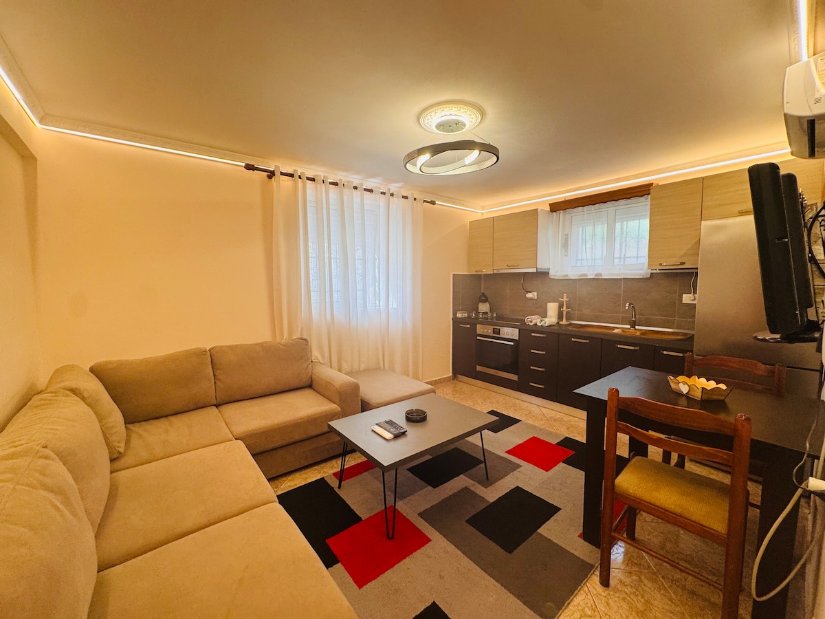 Beautiful one bedroom apartment with a big Living room and kitchen in the center of Sarande. Lately renovated with modern furniture and appliances. Beautiful view of the city during day and night. 3 mins away from the beach and the pedestrian walk. Very close to the grocery stores and cloth boutiques. (Note: The building has no functional elevator so be prepared to climb stairs)
