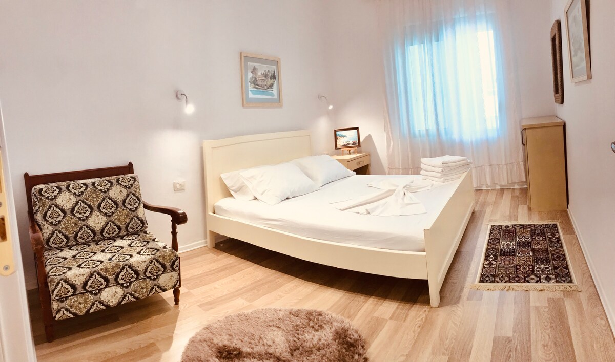 Modern balinese style, with all amenities, the best place in Saranda for couples but even for small families. Centrally located, 3 minutes walk from promenade bar restaurants and the public beach, nearest supermarket 3 minutes walk. Fully furnished, fast Internet 300Mbps. Unbelievable view over Saranda bay and Corfù island.