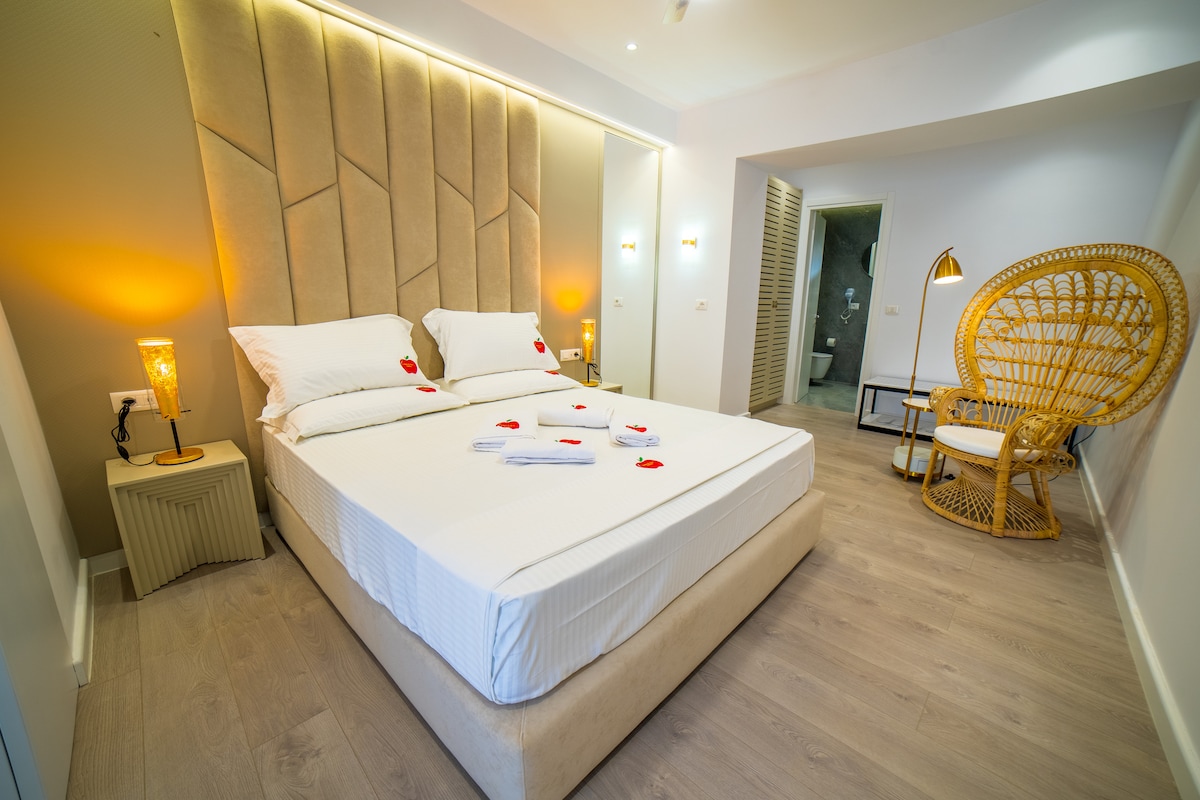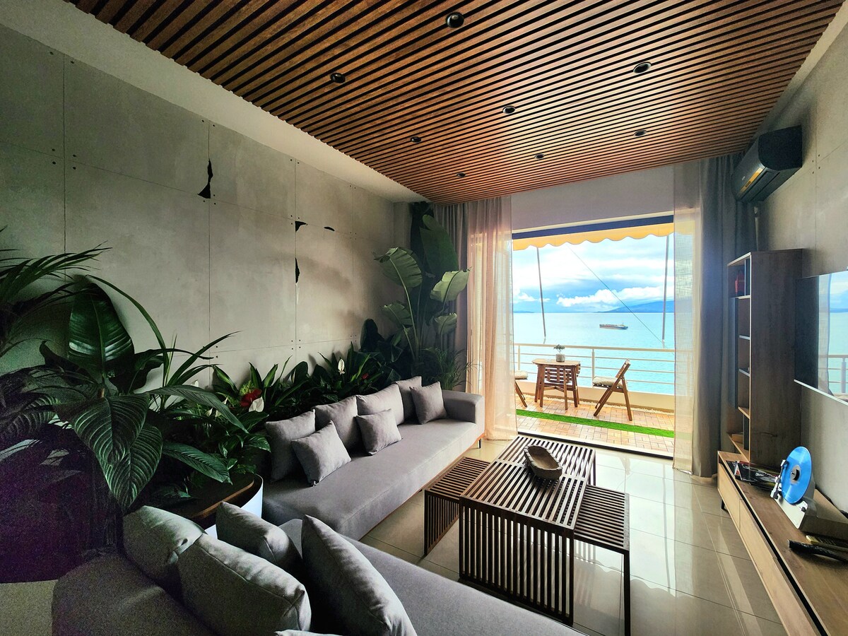 Modern balinese style, with all amenities, the best place in Saranda for couples but even for small families. Centrally located, 3 minutes walk from promenade bar restaurants and the public beach, nearest supermarket 3 minutes walk. Fully furnished, fast Internet 300Mbps. Unbelievable view over Saranda bay and Corfù island.