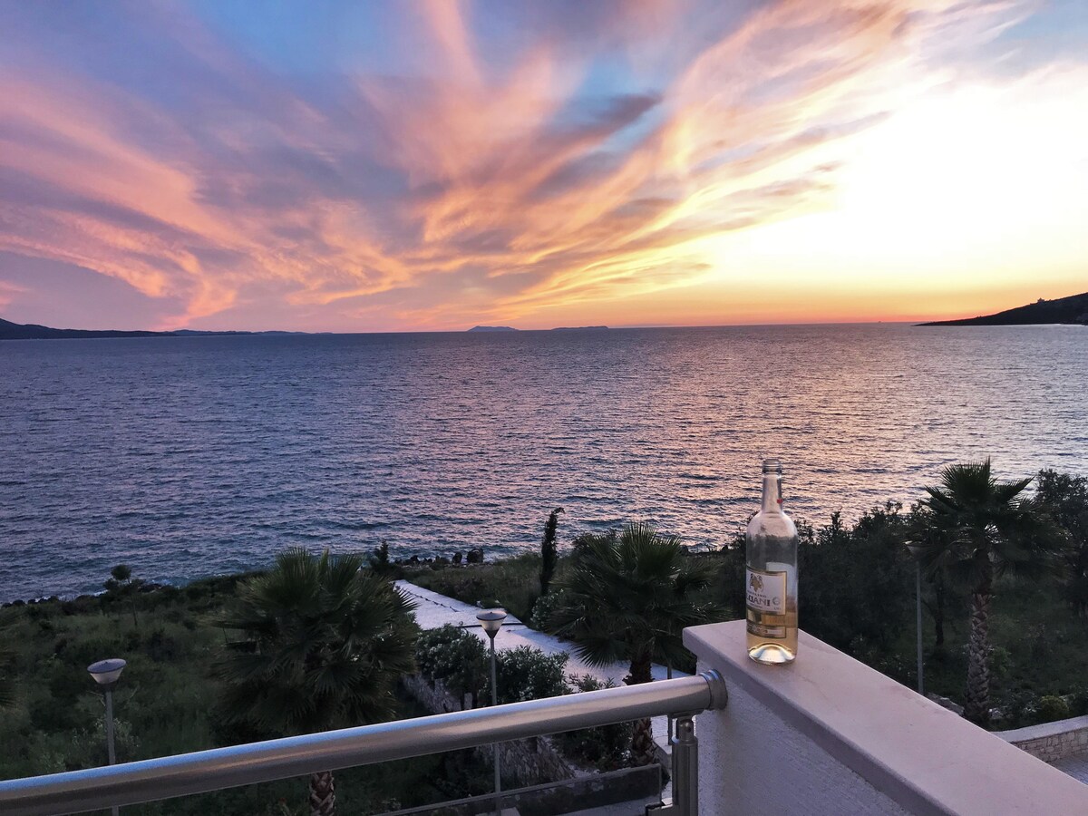 Experience a world of wonder as you immerse in a dreamy coastal getaway offering mornings and sunsets, with a private beach 1-min away downstairs overlooking the Ionian Sea. Our stunning apartment at Bougainville Bay offers spacious and bright interiors adorned with high ceilings showcasing breathtaking sea views. Designed by the architect of our family, our mom, the apartment beautifully blends with the picturesque surroundings of bougainvillea flowers and olive groves of Sarandë.