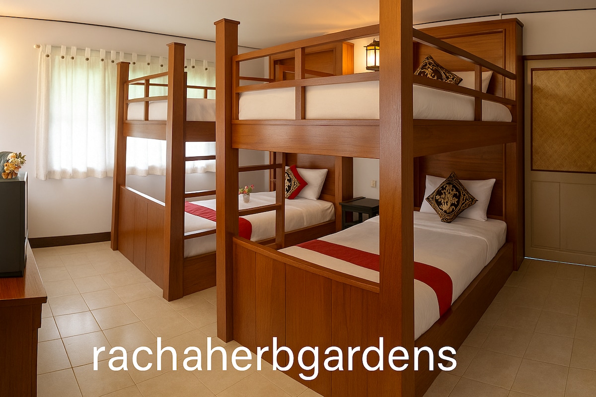 Enjoy a quiet stay in a peaceful garden home surrounded by nature. This simple and comfortable room features two bunk beds and can accommodate up to 4 guests, ideal for friends or small families. The shared outdoor bathroom is clean and easy to access. Guests may use a small shared kitchen with a refrigerator and microwave, as well as a shared living area for relaxing. Perfect for travelers seeking a calm, nature-focused stay with shared facilities.