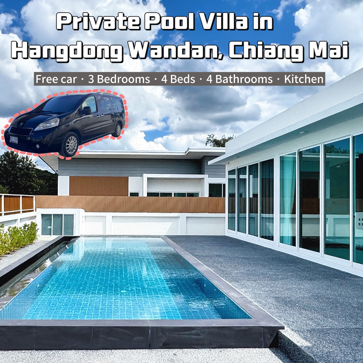 🏠日式风格泳池别墅🏠 4*8米私人泳池,可容纳10人居住,适合家庭、好友及团队入住。别墅建立在安全漂亮的市中心,面积265-324平方米,室外有草坪和绿植围绕,配有24小时的安保监控系统,全屋落地窗户设计,采光非常好,拍照原相机都足够出片!!!居住有亲近自然放松身心的感觉🍃🍃🍃 🛌全屋4个卧室都配置有空调和热水器。 卧室1:King size大床+衣柜+独立卫浴+浴缸+可加床 卧室2.: King size大床+衣柜 洗手间及浴室 卧室3.: King size大床+衣柜 洗手间及浴室 卧室4.:一楼卧室,King size大床 有明亮宽敞可见泳池景观的客厅,现代欧式厨房,用具一应俱全,还有party必备烧烤炉BBQ ⛳️周边设施(坐标二环路200米): 711便利店 Big C Mae Hia 1.7 公里 万客隆 1.8 公里 Sarasas Witaed Lanna 学校 3.2 公里 清迈医院4.2 公里 莲花 4.5 公里 清迈机场10分钟车程 MAYA商场 20分钟车程