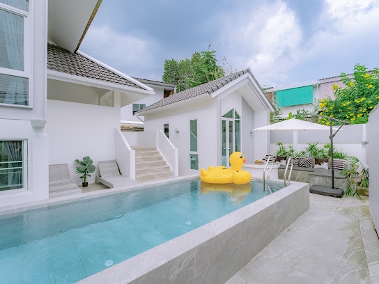 Discover Your Tranquil Retreat in Chiang Mai Nestled amidst lush teak trees, our guesthouse villa offers a serene escape from the city's hustle & bustle. Wake up to nature's sounds and panoramic pond views. Enjoy the sparkling garden pool, perfect for a refreshing dip or sun lounging. All rooms are air-conditioned for your comfort. Come and experience the perfect blend of peaceful countryside living with easy access to the cultural treasures of Chiang Mai just 20-30 minutes away.