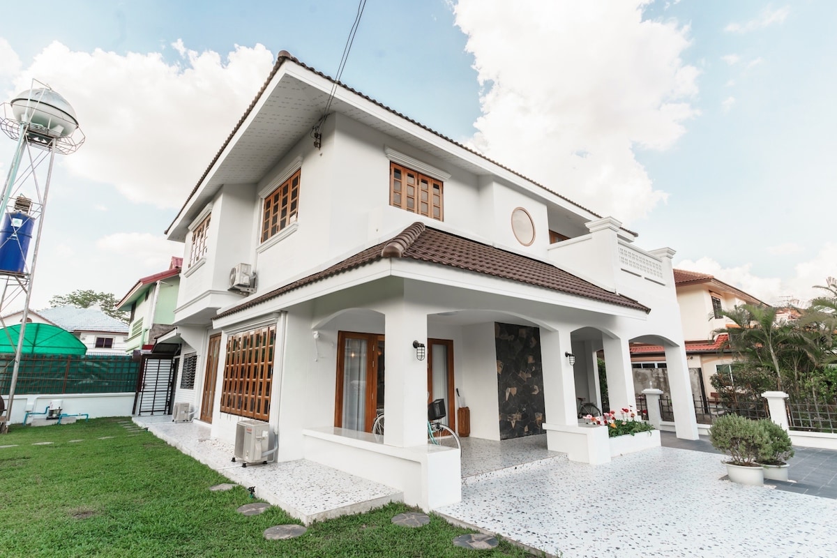 A newly renovated house is located in the city, only 5 minutes away from the airport and popular tourist attractions such as Walking Street, Night Bazaar, and the Old City (Ku Muang). It is quiet and easily accessible situated within a secured community that provides 24hrs security. The house is a few steps (~20m) away from the village's swimming pool, sauna room, gym room and the green garden. The house is suitable for families and groups of friends.