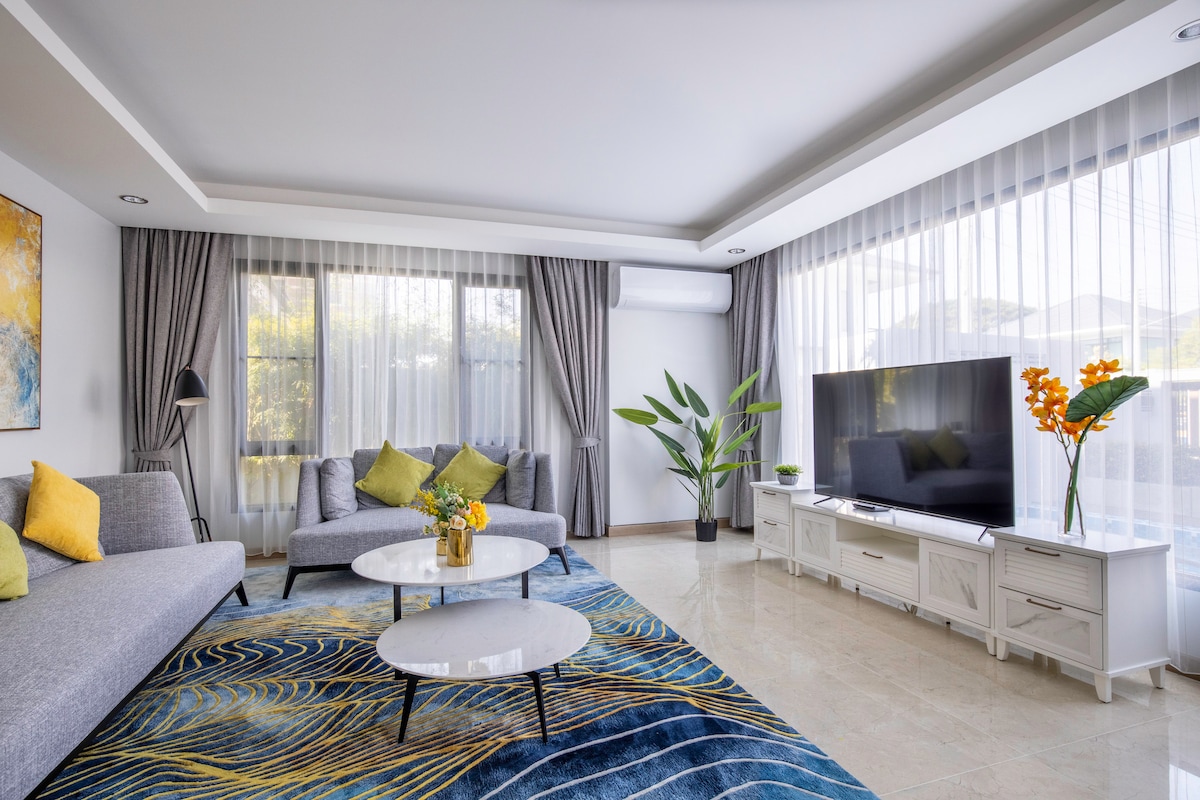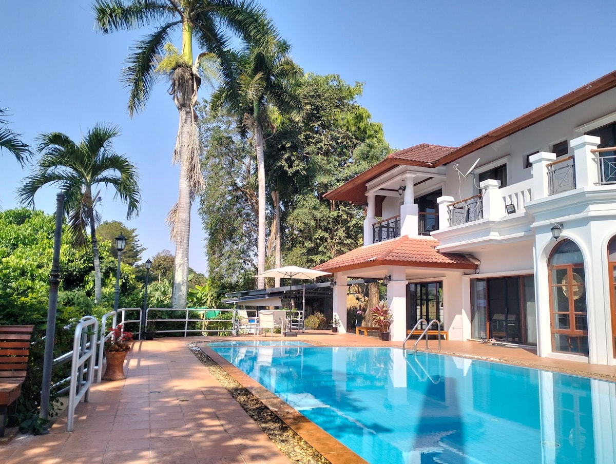 这栋充满活力的热带别墅位于清迈的黄金地段,WangTan 小区重叠机场商圈非常适合大型团体和与家人或朋友聚会。别墅配备各种设施,包括大型游泳池、按摩浴缸.可供您全方位娱乐。我们的户外可看私人湖泊的美景,地理位置优越,可轻松前往市区,靠近便利店和超级市场。我们还应要求提供餐饮和交通服务,费用由房客自行承担。 房源介绍 这是一栋现代风格的2层别墅,屋顶可欣赏私人湖泊,还有一个带按摩浴缸的大泳池。 *5间卧室*6个卫生间 *宽敞的公共区域 *配备电器的西式厨房*每个房间配备智能电视*一次性洗漱用品*茶水工作台*大型环绕式泳池露台 这栋别墅最多可容纳10人,设施齐全,让每个人都能玩得开心。优雅与安静的心灵放松之地.这里是家庭度假、商务团体和大型朋友团体的理想之选。5间卧室和6个卫生间确保所有房客的隐私。室内光线充足,与木制家具融为一体,营造出温馨舒适的环境。 公共区域通往泳池露台,露台宽敞,是一个不错的聚会场所。游泳池是一个超大泳池,大小适合成人和儿童入住。大门是遥控的,房源周围的墙壁建造得很高,以确保我们的房客拥有极致的隐私。 别墅外部是森林景观避免不了蚊虫. 提前告知. 不喜勿定