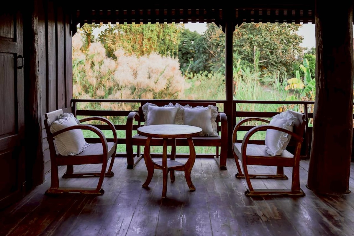 嗨!欢迎您来我家做客。我们很幸运地在市中心附近有一个大院子。这个木屋特别适合都市人来做短暂休息和放松,这里有非常适合放空的大花园和13米长的泳池。房子设计理念来自传统泰北农村的兰纳谷仓(二楼卧室、一楼存放生产资料、厨房及休息空间),我们在此基础把传统的房子改成更高空间、拥有更多采光,也在楼上楼下都配有洗漱卫生间。同时我们非常喜欢日式房屋内装的简约,所以做了融合。此外,房子里的古董家具和摆设都是我们过去几年在清迈所淘来,有些刚好和房子非常搭配,就随心地布置了。房子里的艺术画作均来自我孩子的父亲,他是本地艺术家。 如果您预定,将会使用整栋房子及花园和游泳池,房客会有独立的入口,另一侧是房东居住,因花园足够大,两个房子之间有20-30米距离,彼此都有足够的私密性。 抱歉,我们暂时不分开预定房间。 厨房提供全面的烹饪工具和厨餐具,还有洗衣机和烘干机。我们平时生活状态比较灵活休闲,周末可以带房客练瑜伽、徒步爬山、一起逛菜市场做泰餐、或一起玩水彩画画,如有兴趣,请主动给信号哦!
