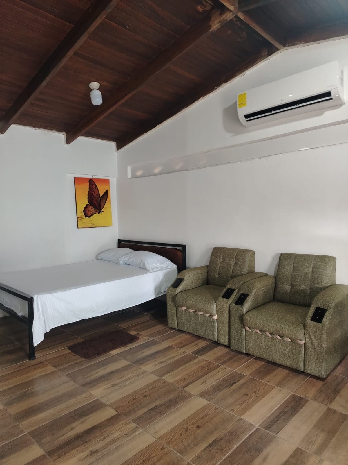 tienes un dormitorio con su baño y cocina privada con todas las comodidades , aire acondicionado y ducha , también puedes disfrutar de amplias zonas verdes y piscina compartidas con otros huéspedes disfrutando de una vista increíble de amplias vejetacion y aves , es un lugar tranquilo para conectar con la naturaleza. el ingreso al alojamiento consta de portón eléctrico y camara de seguridad dónde solamente los huespedes tienen acceso .
