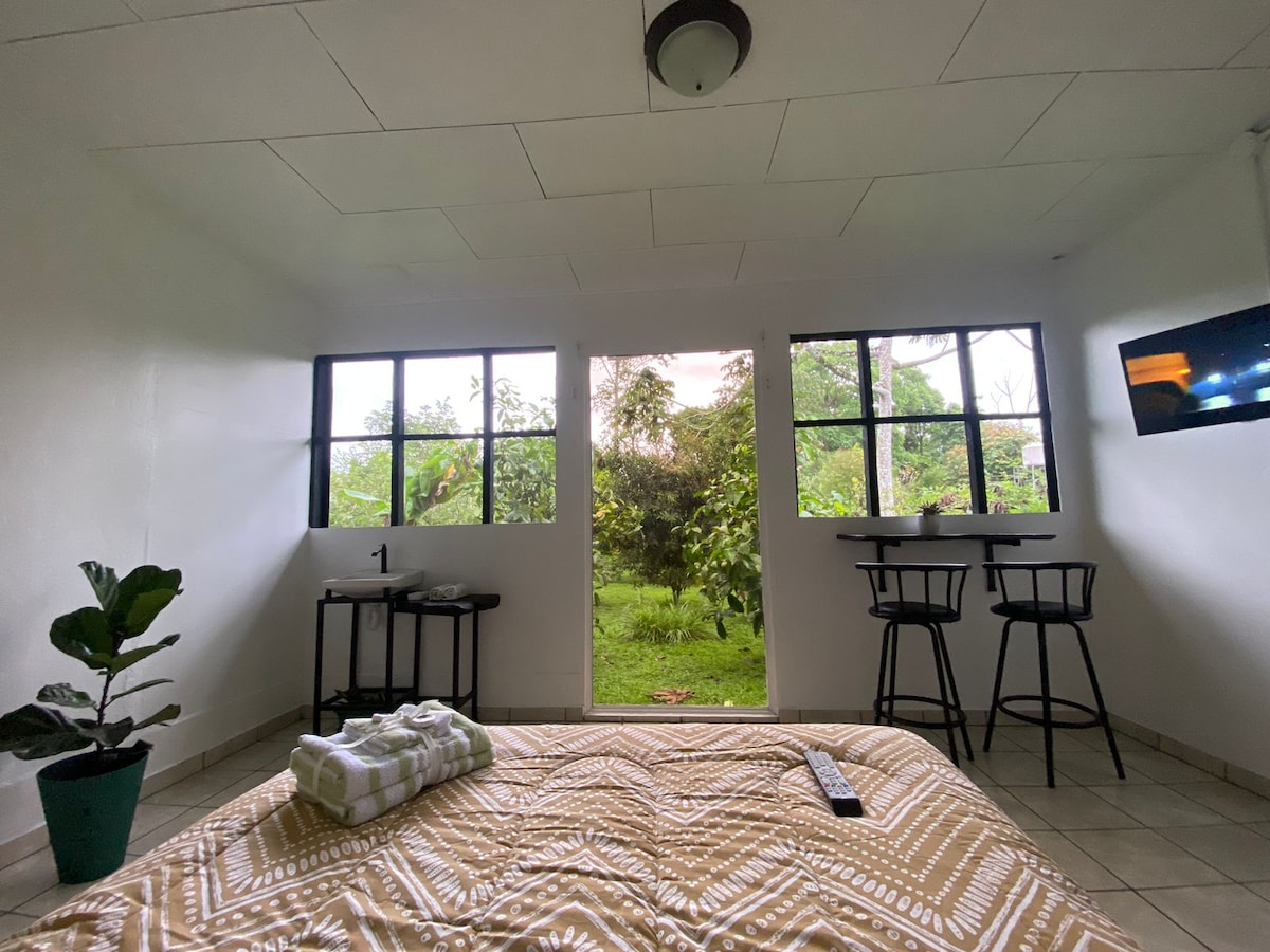 This room is located within Chilamate Rainforest Eco-retreat it's a private room with king sized bed and patio facing the rainforest. The cost of your stay includes breakfast and access to trails in the forest. You will also have access to a shared kitchen. We are located on the Sarapiqui riverfront. Excellent wifi and close to many local attractions and activities that we can help organize in reception!!!