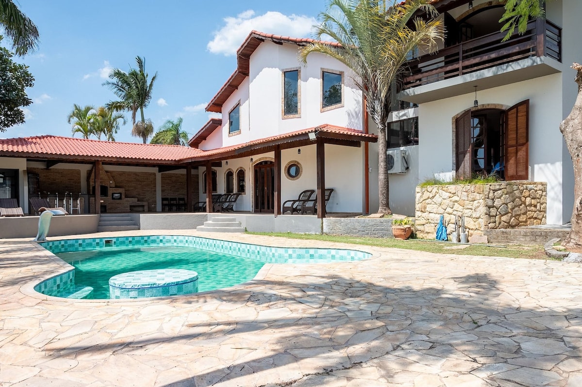 Máximo permitido: 16 pessoas Não permitimos qualquer tipo de evento. Nosso sítio é um verdadeiro refúgio verde em SP. Seu grupo terá mais de 15 mil m² de área para desfrutar, com piscina, salão de jogos, smartTV, wifi, campo de Beach tennis e futebol, churrasqueira e forno de pizza em uma casa aconchegante e familiar. Todos os quartos têm banheiro, ventiladores e cobertores. Deliciem-se com árvores frutíferas, lindas aves, um céu estrelado fascinante e vista para Floresta Nacional de Ipanema!
