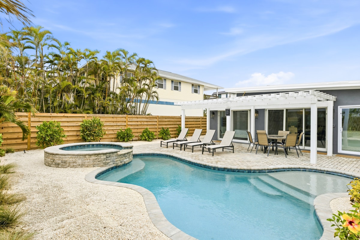 Discover your perfect Siesta Key getaway in this vibrant 3BR, pet freindly duplex in the peaceful South Village. Just steps from the Gulf Coast beaches, this private retreat blends colorful décor, modern comfort, and playful outdoor fun. Lounge by the private 𝐡𝐞𝐚𝐭𝐞𝐝 𝐩𝐨𝐨𝐥, soak in the 𝐡𝐨𝐭 𝐭𝐮𝐛, or enjoy the backyard murals perfect for families, groups, and beach lovers. Book now for an unforgettable stay! <b>☀ Private Pool ☀ BBQ Grill ☀ Easy Beach Access</b>
