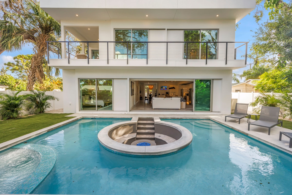 Palm Villa is a brand-new modern tropical retreat offering the perfect blend of luxury, comfort, and indoor-outdoor living. With six ensuite bedrooms, soaring ceilings, and a chef’s kitchen, the home is designed for both relaxation and entertaining. Slide open the 90° glass doors to your private oasis, where a saltwater pool with spa and sun shelf, covered lanai with al-fresco dining, outdoor TV, and a gas fire pit set the stage for unforgettable gatherings. Just minutes from Siesta Key Beach.