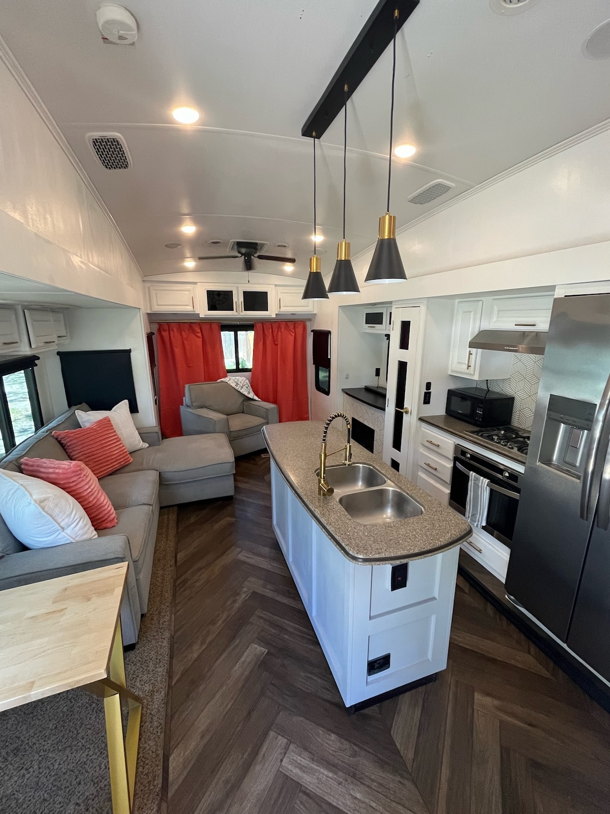 This RV is located in a residential neighborhood in Venice FL. This almost new (2022 model) travel trailer officially sleeps 8, although less people would be more comfortable. Our family of 4 fit great in this RV. The RV comes prepared with all the cooking utensils, bedsheets, towels, soap, and all the things you might need. It has a fridge and freezer, stove, oven, microwave, TV, DVD player, many DVDs, radio with speakers inside and outside.