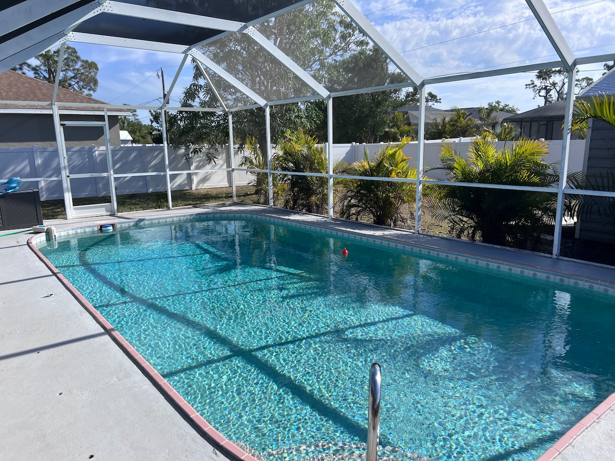 Welcome to Golf Cove Paradise ☀️ A peaceful resort style outdoor space + private + oversized solar heated pool creates a perfect vacation oasis. Covered lanai = shade. BBQ & watch your favorite sports on 55” outdoor tv. Walk the golf cart paths, swim laps, get a tan, read a book, play music & games, sip on tropical drinks & float all your cares away. Pretty sunsets overlooking a golf course setting. A.M. coffee outside to hear the birds sing. Carefree outdoor living is what it’s all about here.