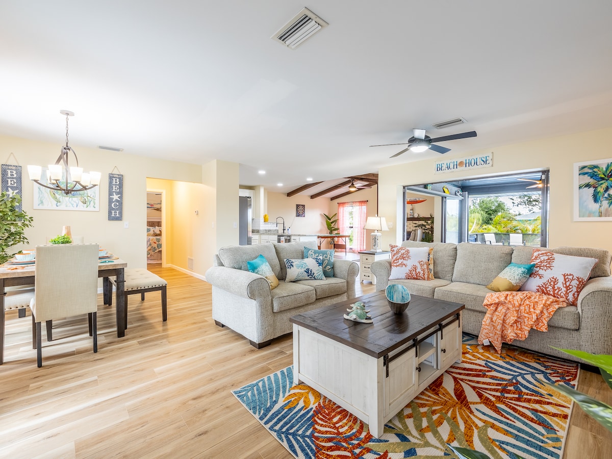 Beautifully updated coastal farmhouse home in a quiet cul de sac with a private pool oasis in the back. The salt water pool is completely screened in so you can stay in the pool all day and night long without worrying about flies or mosquitos. Kitchen is fully stocked and ready for you to cook up a storm! Or if you prefer, downtown Sarasota is only a short 15 minute drive away with plenty of eating options. Siesta key beach is rated the number one beach in the USA and it’s only 30 minutes away!