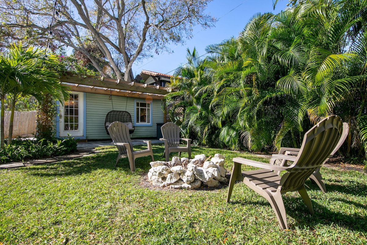 City Garden Cottage is a cozy and comfortable cottage located in the quiet Laurel Park neighborhood in Sarasota, only a few blocks from downtown. The studio is surrounded by lush gardens and trees with a Hot Tub. Inside, you will find a kitchenette equipped with a coffee maker, toaster, refrigerator, and hot plate. The studio also has a flat-screen TV, a queen bed & private bathroom. There is also shared use a gas grill, fire pit and Hot Tub included with the rental.