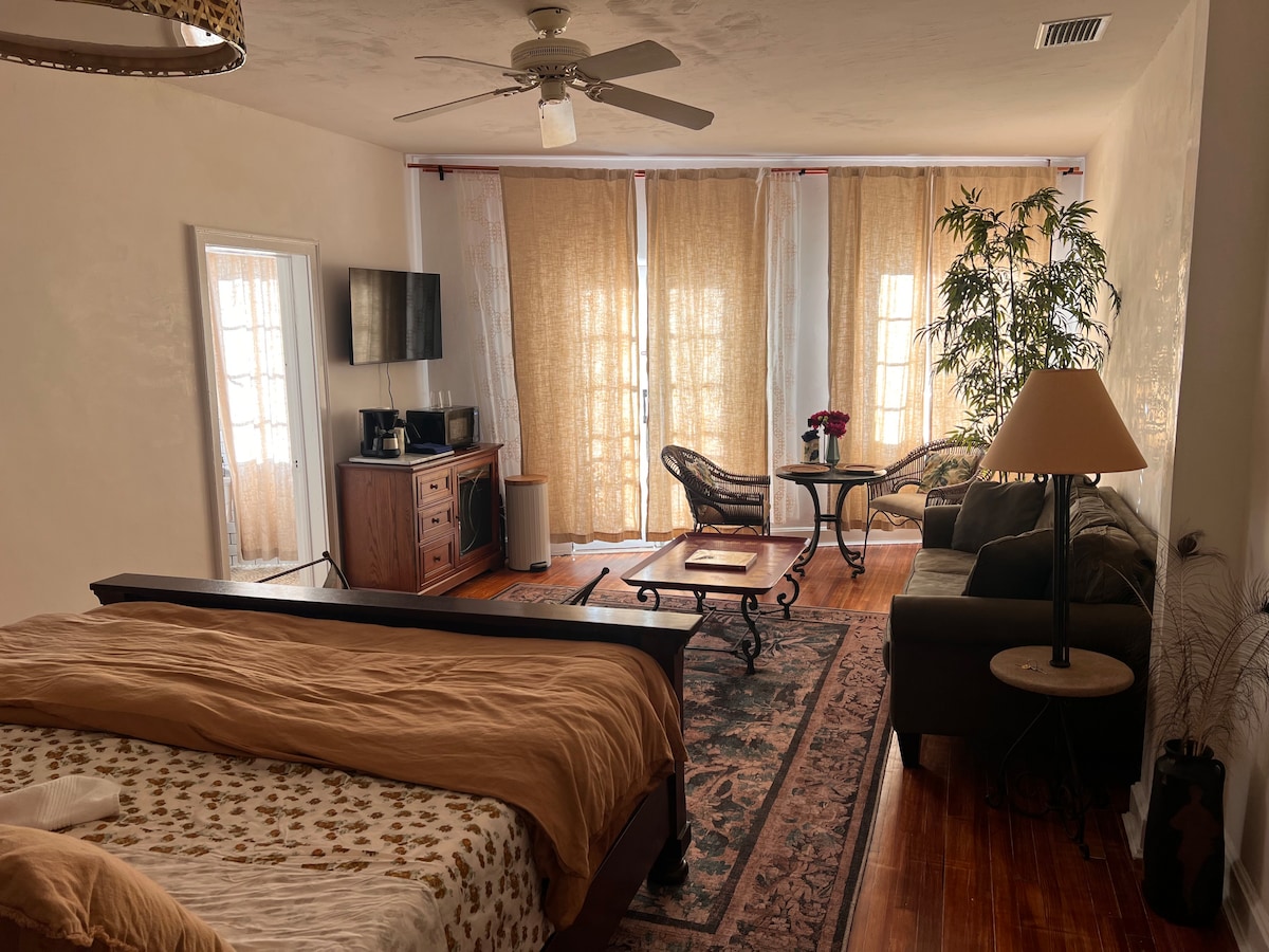 Super cute and romantic studio with french doors over a balcony in a safe and quaint historic district, award-winning restaurants and businesses. King sized bed, sofa and dining for two. Small refrigerator, coffee pot, microwave in space, glasses, and dishes. The unit is decorated beautifully with great attention to detail. It is clean and feels like home with amenities needed to stay a night or week or month. The location is in the southern part of downtown.