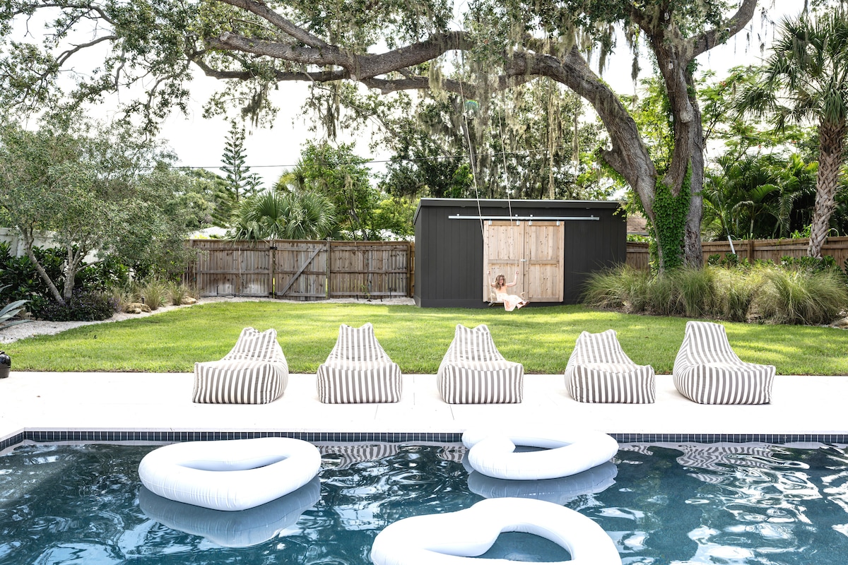 Just outside of Downtown near the Legacy Trail, this home is located in a quiet neighborhood only 15 minutes from the Siesta Key Beach. The home stands out with its bright and airy design, brand new saltwater pool in the private backyard, and its breezy living room. The large master bathroom rain shower is perfect to wash off the leftover sand from the beach. You can also spend your evenings grilling out back or playing corn hole in the patio area.