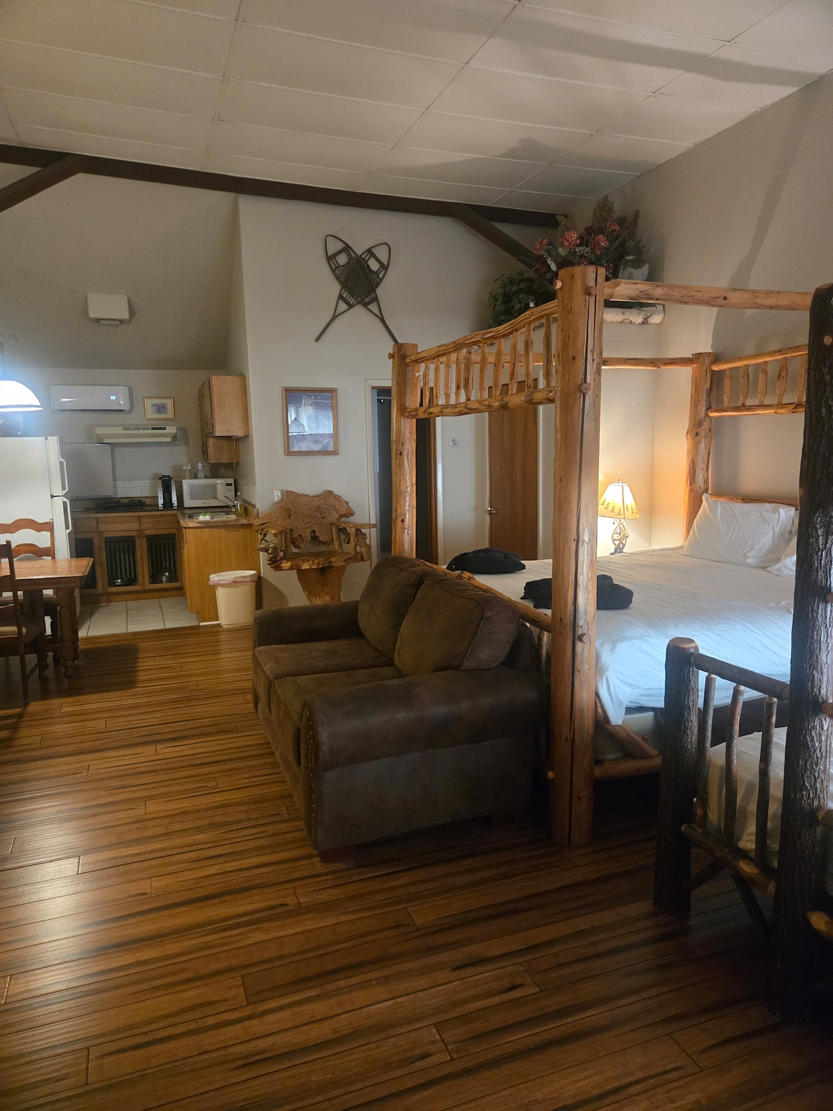 一张标准双人床、厨房、小木屋