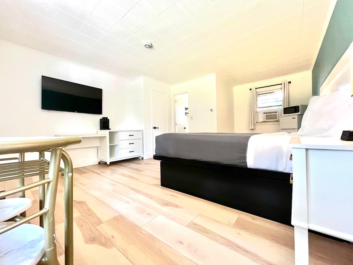 Welcome to Your Cozy Getaway! Our Sunrise Studio is perfect for couples or small families, fitting up to 3 guests. Nestled by the lake, this spacious room offers everything for a relaxing stay. Wake up to sunrise views from your lakefront balcony and enjoy your coffee. The lake is a short stroll away for a dip. Inside, enjoy the compact kitchen, pullout sofa bed, 50-inch TV, free WIFI, and climate-controlled air. A pool is nearby, just a quick drive from your room.
