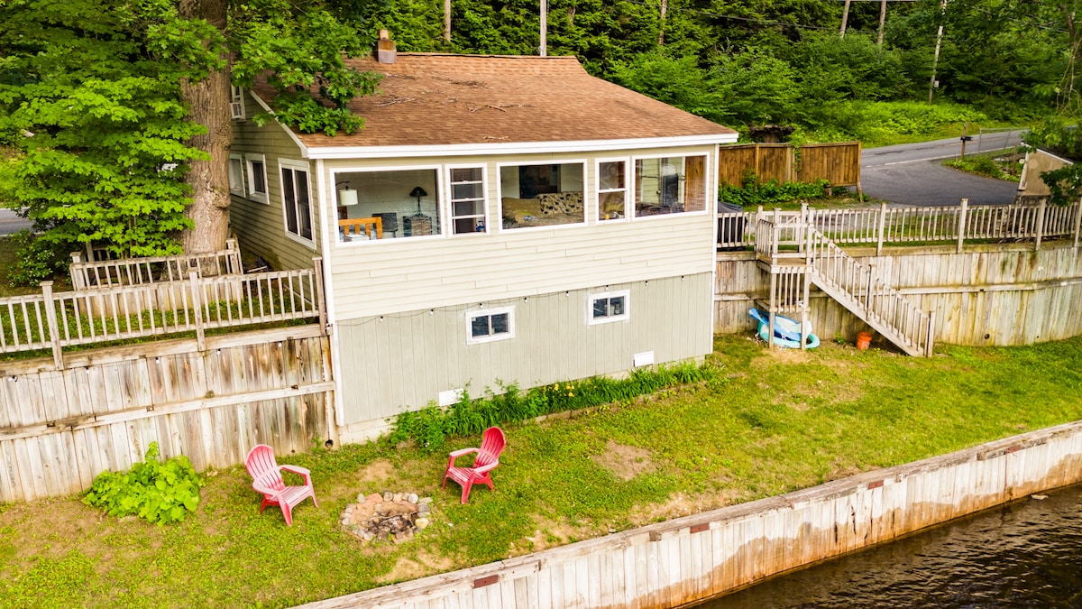 This is my favorite of all 19 cabins at Towpath Landing! 200 degree water views from huge deck just feet from the water and serene privacy - there is a shed on the property not another cabin. Super romantic with a huge fire pit and your own little beachy kayak launch. Vischer Ferry bike trail borders the property for biking, hiking and kayaking. Vaulted beamed ceiling and full walls of glass make for crazy views overlooking the river. Serviced by filtered river water. SO SO PEACEFUL HERE!