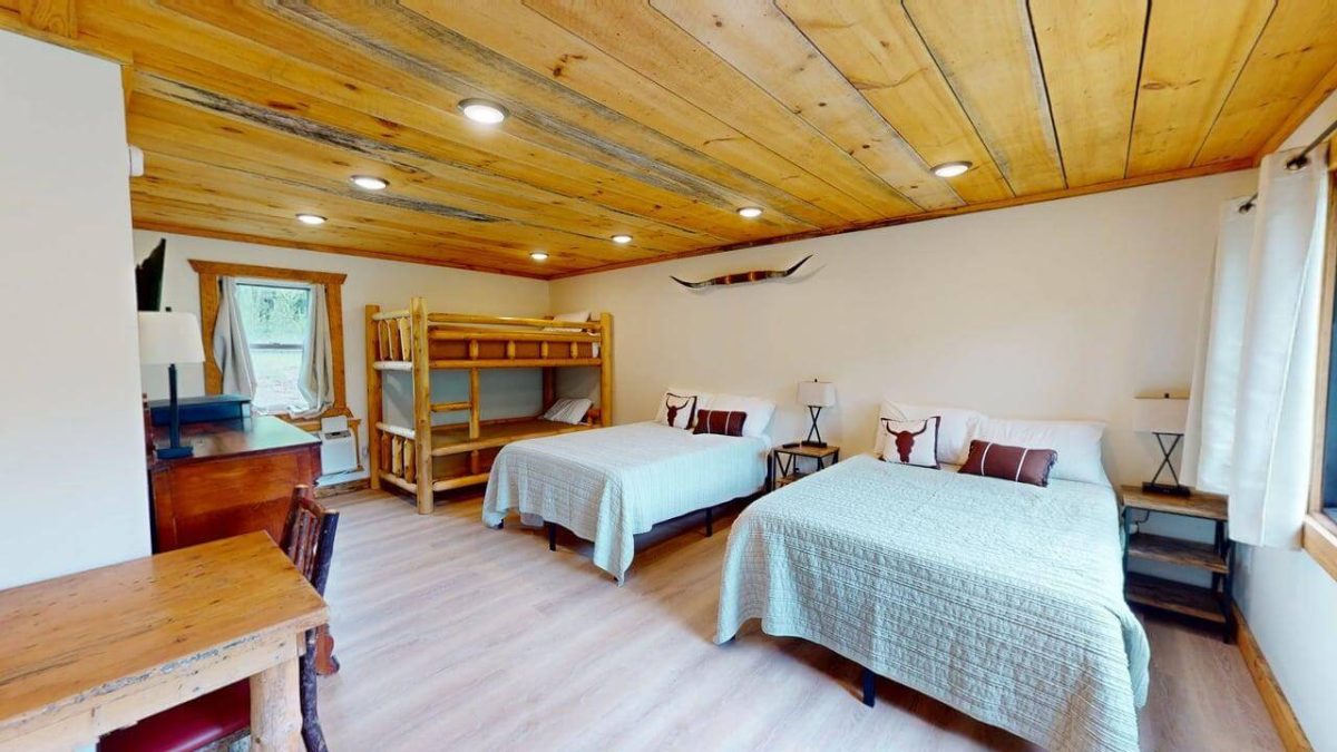 See more of us on Prime Video's tv show, June Farms... streaming now! This cabin is a stunning, rustic, open-floor-plan retreat. The screened-in front porch looks down onto our horse pasture. This cabin is our most romantic cabin on the property. Our gigantic rain shower in the bathroom has an 8'x5' wall mirror and a French door that opens out to the forest. If you are a cook, this cabin is a chef's dream. You might also like our stunning new cabin called The Farmhouse.