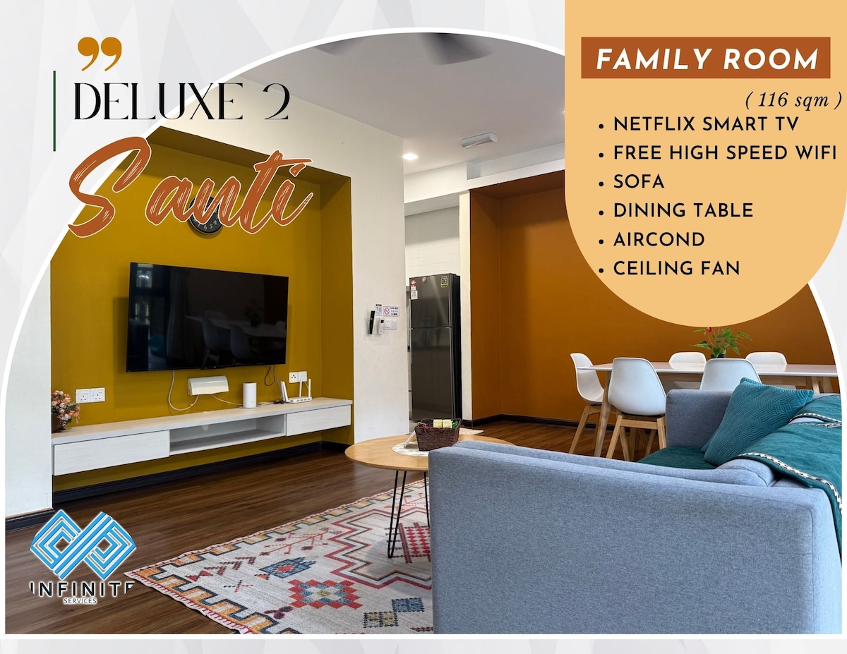 Cozy and comfortable place to stay with Family, Lover and Friends after the journey. This suite comes with 4 Bedroom (Queen Size Bed) and 4 Bathroom (2 common bathroom and 2 private bathroom) which can accommodate up to 8 pax We do provide amenities such as: - Flat-panel TV in a common area - Air Conditioning - Water purifier - Refrigerator - Kitchen Diningware - Free WIFI - Washing Machine - Clean Bath Towels (according to total number of guests) - Water Heater for shower - Hair Dryer & etc