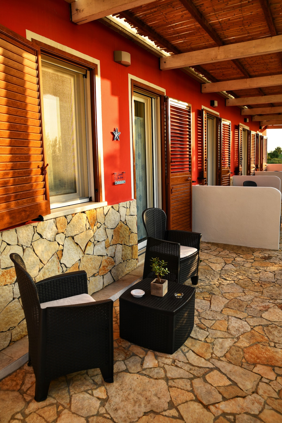 The rooms are located on the ground floor and are easily accessible for disabled people. All our rooms are air conditioned and have comfortable private bathrooms. The welcoming rooms are very spacious and furnished differently from each other, according to themes of shapes and colors linked to the surrounding nature. Each accommodation also has outdoor tables and chairs, a comfortable and pleasant corner that you can us