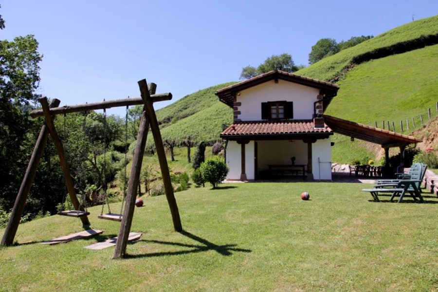 Hermosa casa de campo en el Pais Vasco Frances , en Sara, uno de los 100 pueblos con encanto de Francia. Rodeada de un jardin cerrado, consta de dos plantas: en la planta baja está el salon con chimenea, el comedor y la cocina y un baño; en la planta de arriba están los cinco dormitorios y un baño, asi mismo dispone de garage cerrado para dos coches. Posibilidad de tener cuna Equipada totalmente con mantas, almohadas etc …menage de cocina, productos de limpieza, trapos de cocina