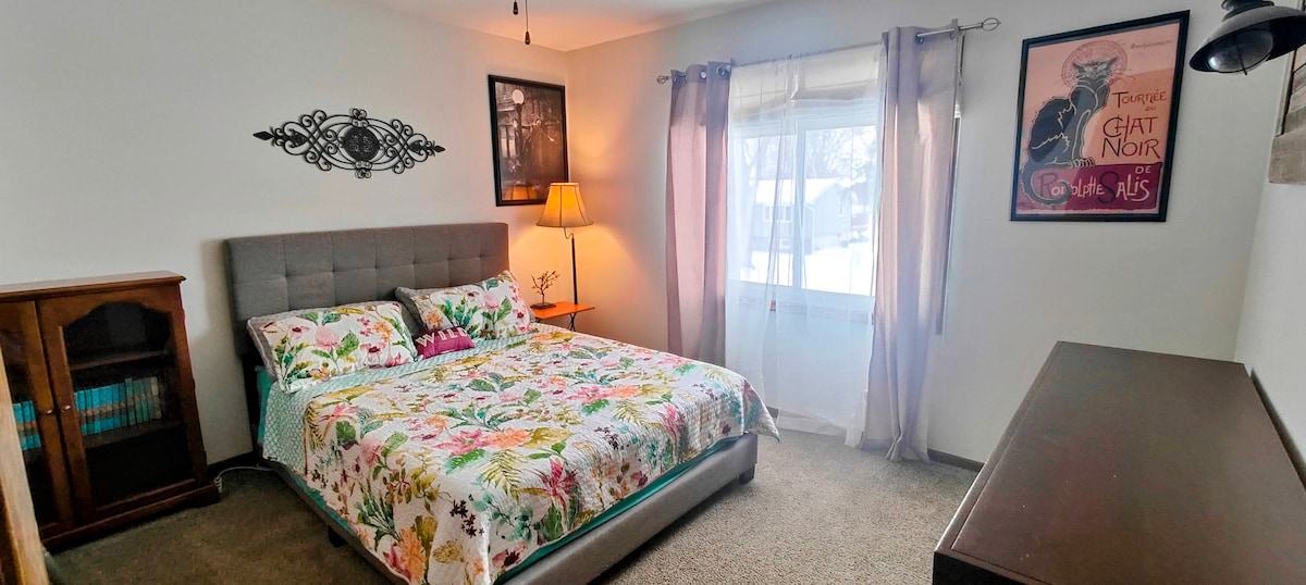 Step into a peaceful retreat where comfort meets care. This warm, inviting room blends cottage charm with modern touches—soft neutrals, plush bedding, and calming natural light through a large window overlooking a quiet neighborhood. Guests love the homey feel, thoughtful touches, and welcoming vibe. Whether you're arriving late, traveling with pets, or just in need of a restful stopover, this serene space offers everything you need to unwind and feel truly at home.