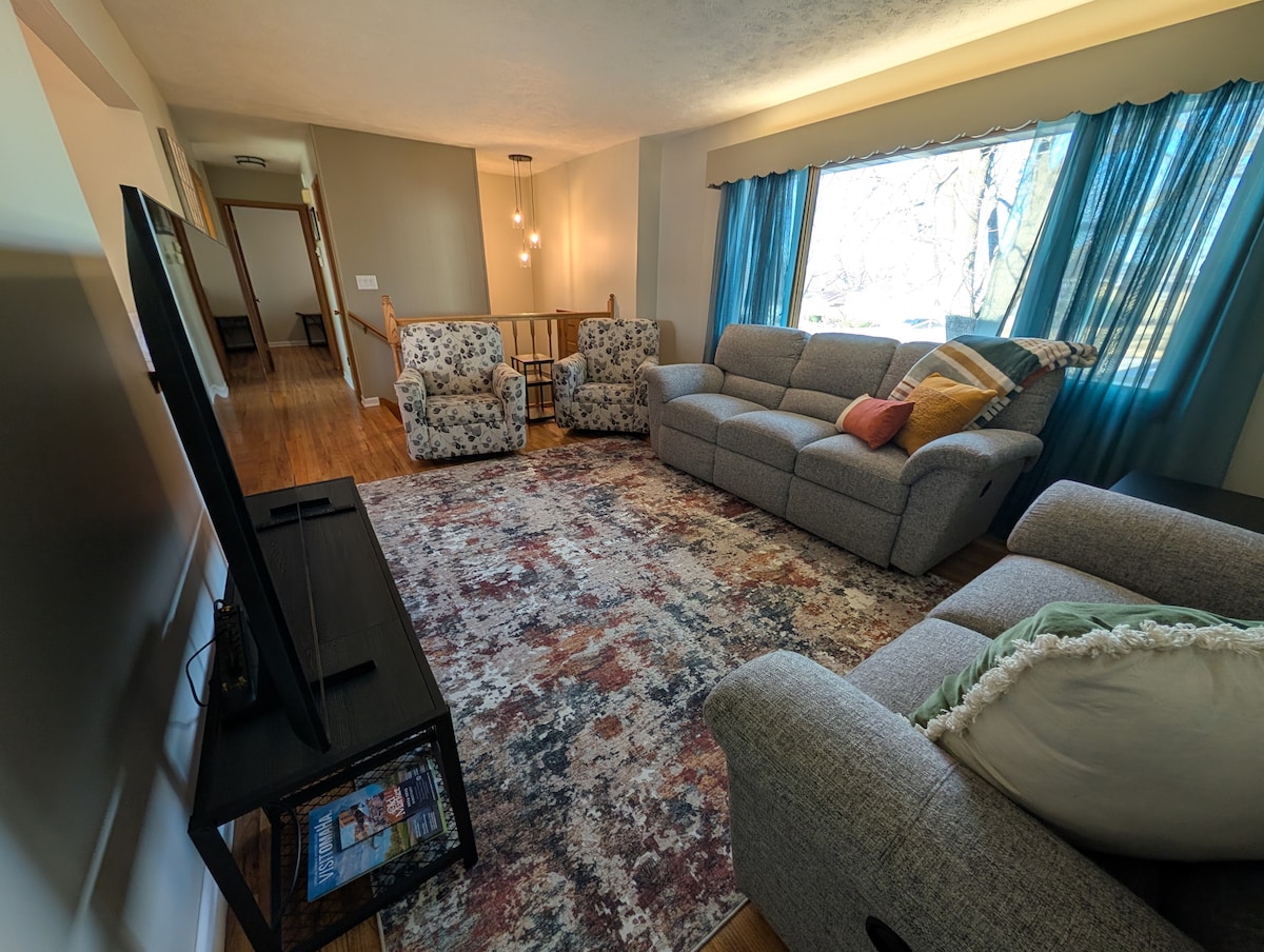 Come for the room, stay for the space! UV cleaned home - 4 Bedroom (2 King Beds), 2.5 bath. Sleeps 8 easily, 15 with pullouts. On 1+ acre surrounded by mature trees, conveniently located between Lincoln & Omaha Bring the family. Lots of privacy. Large backyard. 3 miles from Nebraska Crossing outlet mall; 10 miles to Werner Park; 20 miles from Schwab Field and downtown Omaha; 30 miles to UNMC, UNO, & Creighton; 45 minutes from Lincoln 3 car garage w 1 Level 2 Tesla/EV Charger (48A charging)