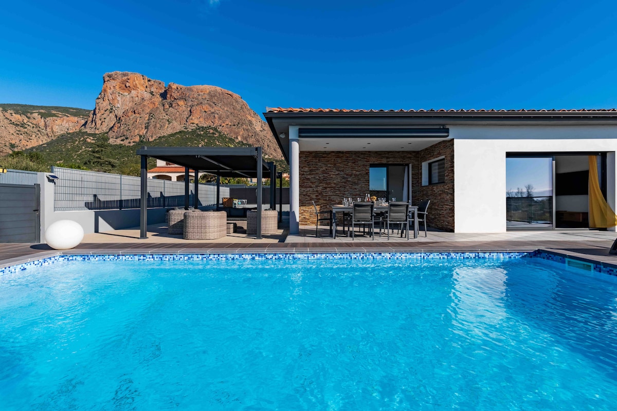Notre logement offre une magnifique vue sur la montagne. Vous partagerez avec nous une piscine de 6X3M. La plage est accessible à pieds. Totalement rénové par nos soins, avec une décoration unique et raffinée. Vous disposez de 2 lits individuels dans la chambre et d’un divan lit 140X190 dans le séjour. La terrasse est équipée de fauteuils, table, chaises, barbecue. Isolés dans un immense jardin vous y serez au calme absolu. Vos enfants et animaux pourront y circuler en toute sécurité