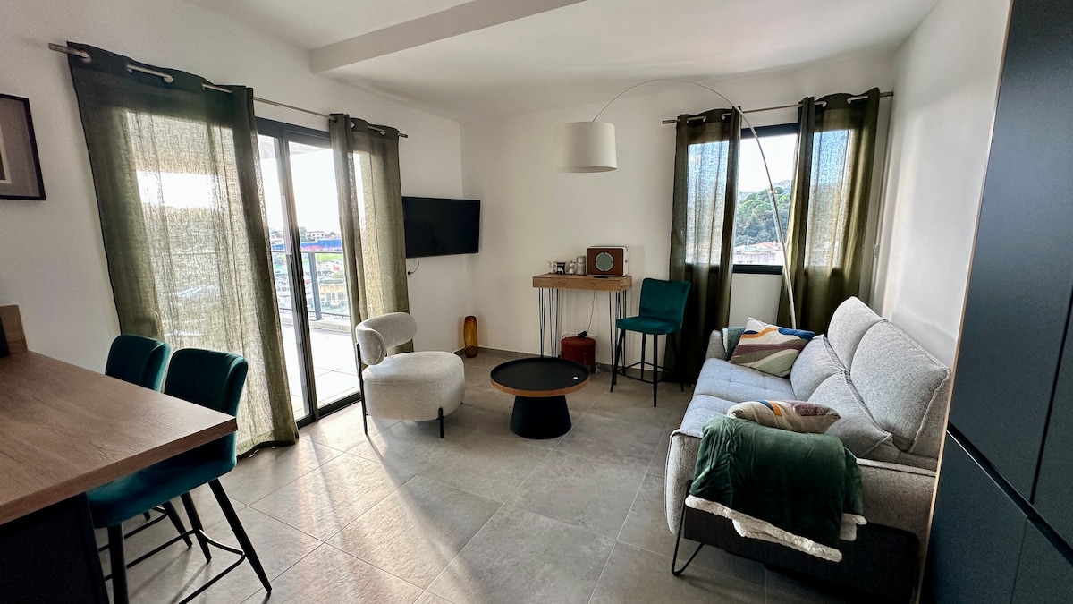 Logement de type F2 neuf, en bas de villa avec vue sur la mer. Cuisine équipée, salle de bain avec douche italienne, chambre avec lit en 160, salon avec canapé convertible, cellier avec machine à laver,sèche linge et congelateur. L’appartement possède une grande terrasse avec barbecue et vue sur la mer. Proche de toutes commodités, à 150m du supermarché casino, et à 2 minutes des plages et du centre ville.