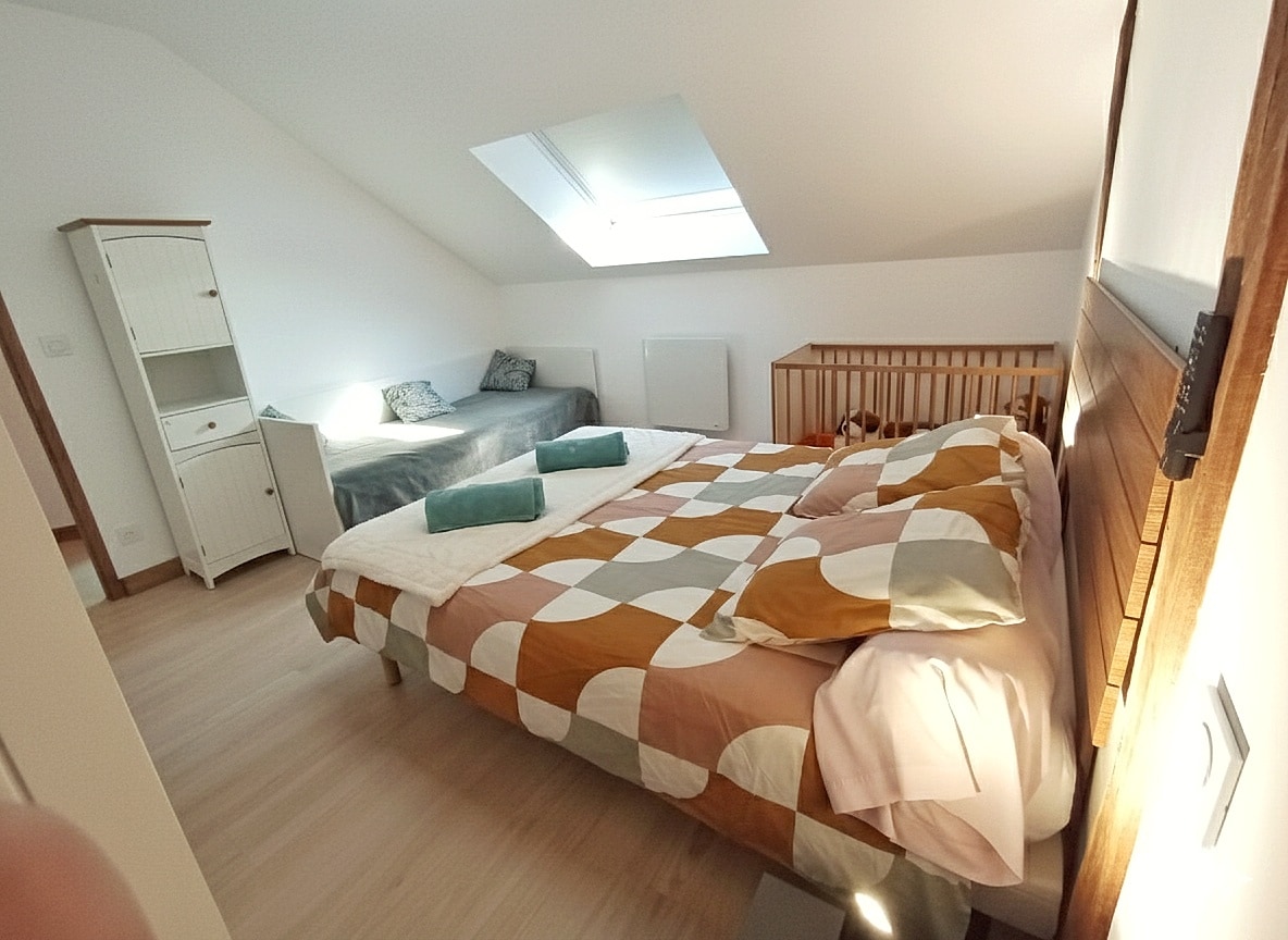 La maison est située à 3 kilomètres du village de Chevillé, en pleine campagne, au milieu des champs. Le logement qui est proposé à la location est une ancienne grange que nous avons entièrement transformée et restaurée. Elle propose le charme de l'ancien et offre le confort de la modernité pour 4 à 6 personnes (dont 2 à 4 enfants), dans un environnement calme, avec un jardin clos de 5000 m2 et un petit étang. Les draps et les serviettes de toilettes sont inclus