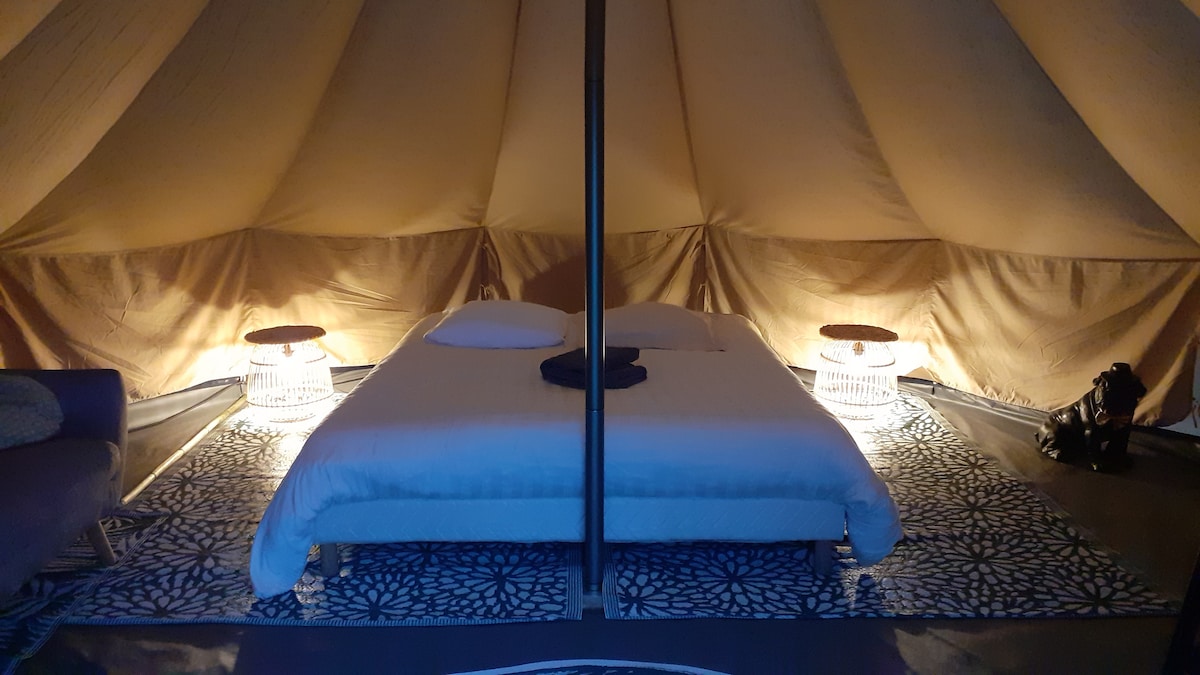 Laissez vous bercer par les sons de la nature dans ce logement unique... A quelques mètres de la forêt, proche de la sortie d'autoroute A11, nous vous accueillons sur notre terrain dans des tentes décorées avec goût.. Equipées de véritable matelas, elles allient confort et respect de la nature. Un espace tente/douche, ainsi qu'un toilette sèche sont disponible. Vous pourrez garer vos voitures sur le terrain en toute sécurité. Possibilité panier petit déjeuner en sus(café, viennoiseries, pain..)
