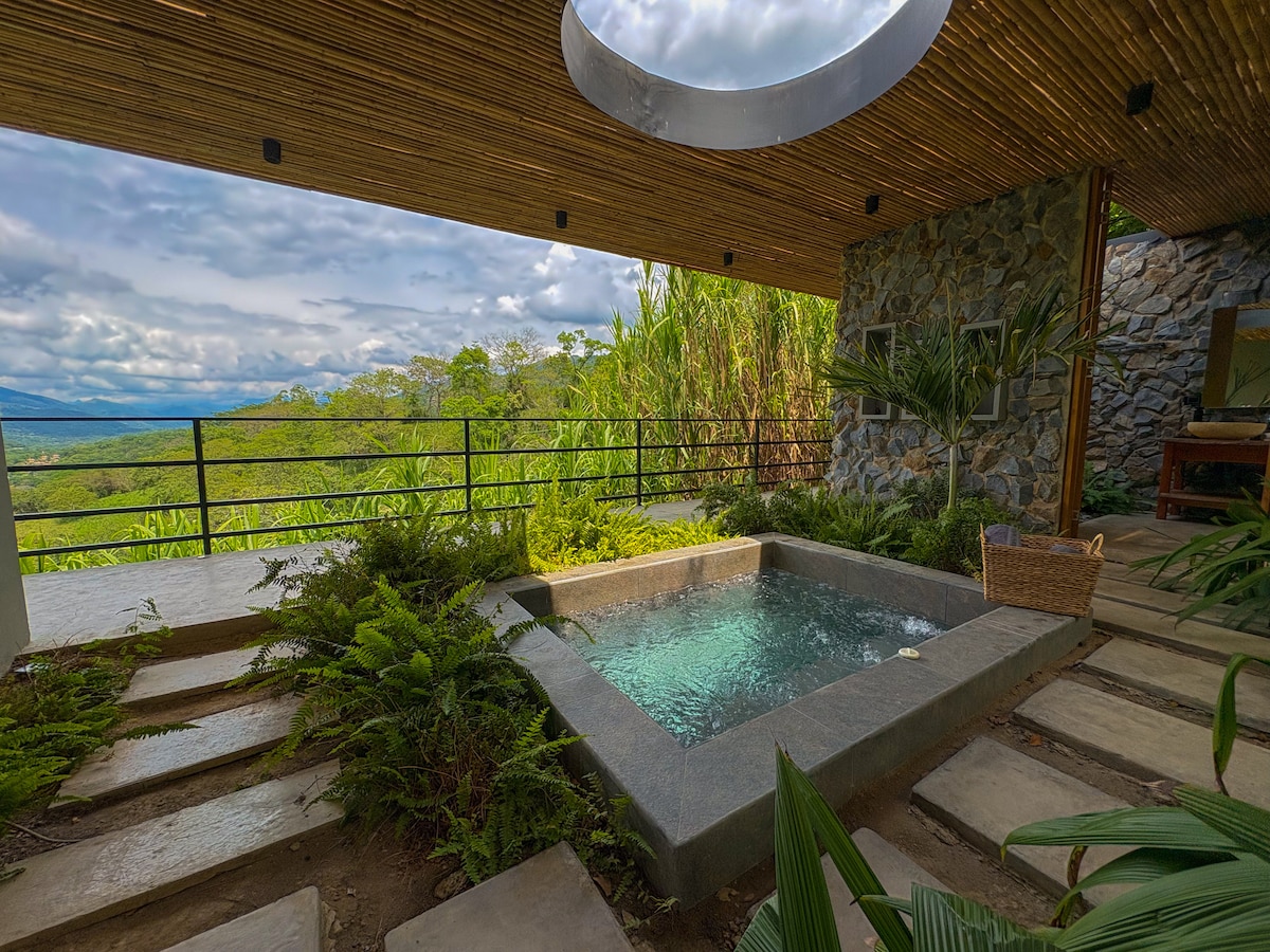 Estrena la última maravilla de Houses in the Sky: Casa Ginger. Una súper cabaña para dos o hasta cuatro personas. Dos habitaciones, dos baños completos. Agüita caliente con buena presión, cama King y un relajante jacuzzi con vista a la quebrada. Delicioso desayuno incluido.