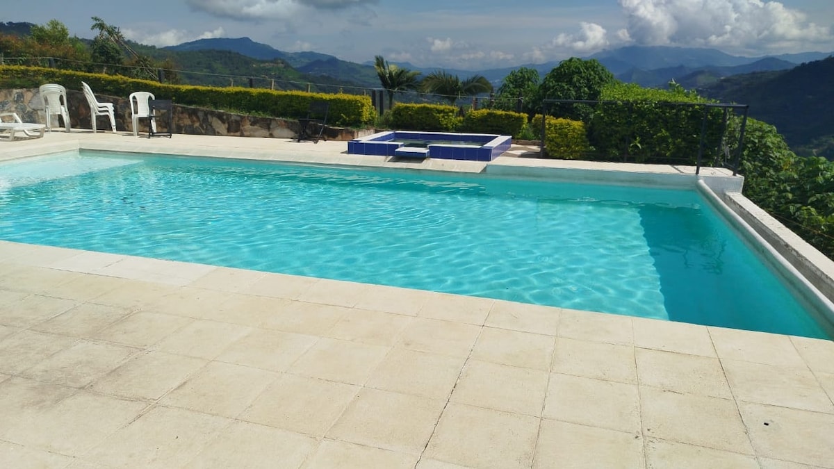 Beautiful country house located just 2 hours from Bogotá in Villeta, Cundinamarca. This house has a pool and jacuzzi, kitchen, 8 bedrooms and 5 bathrooms. It is fully equipped for 20 people, ideal for large groups and families, it is located within the Finca Panorama, a few minutes from the main park, which guarantees the best of both worlds; privacy and proximity to everything you need.