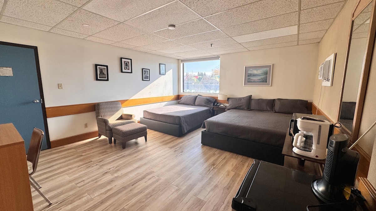 Join us for your next relaxing getaway. Experience small town hospitality, clean air, wide open spaces and peaceful scenery right outside your door. This room has 1 King bed and a living room area