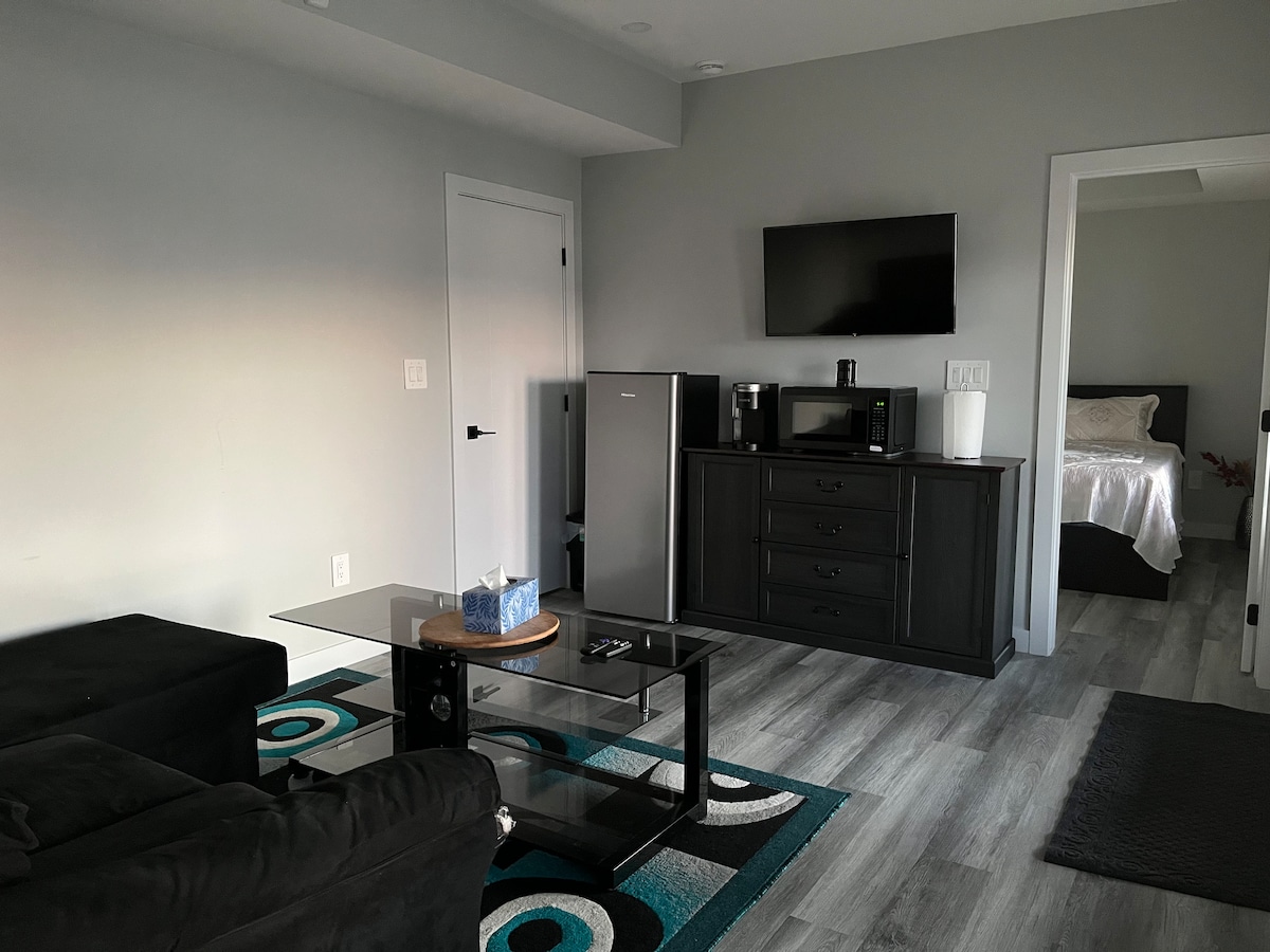 Attn: An EXTERIOR Reno is being done that is currently on hold & It's funky not fancy This suite features: - Driveway parking right beside the entrance - Colour changing LED lit bathroom - 2 beds, couch and TV with streaming box - Separate entrance - Kitchenette - Lots of privacy - AC in summer. Disclaimer: - It is small, about the size of a hotel room. - Prim and proper pple might not like We love to host and provide hauled water, coffee, tea and breakfast as something extra just for you.