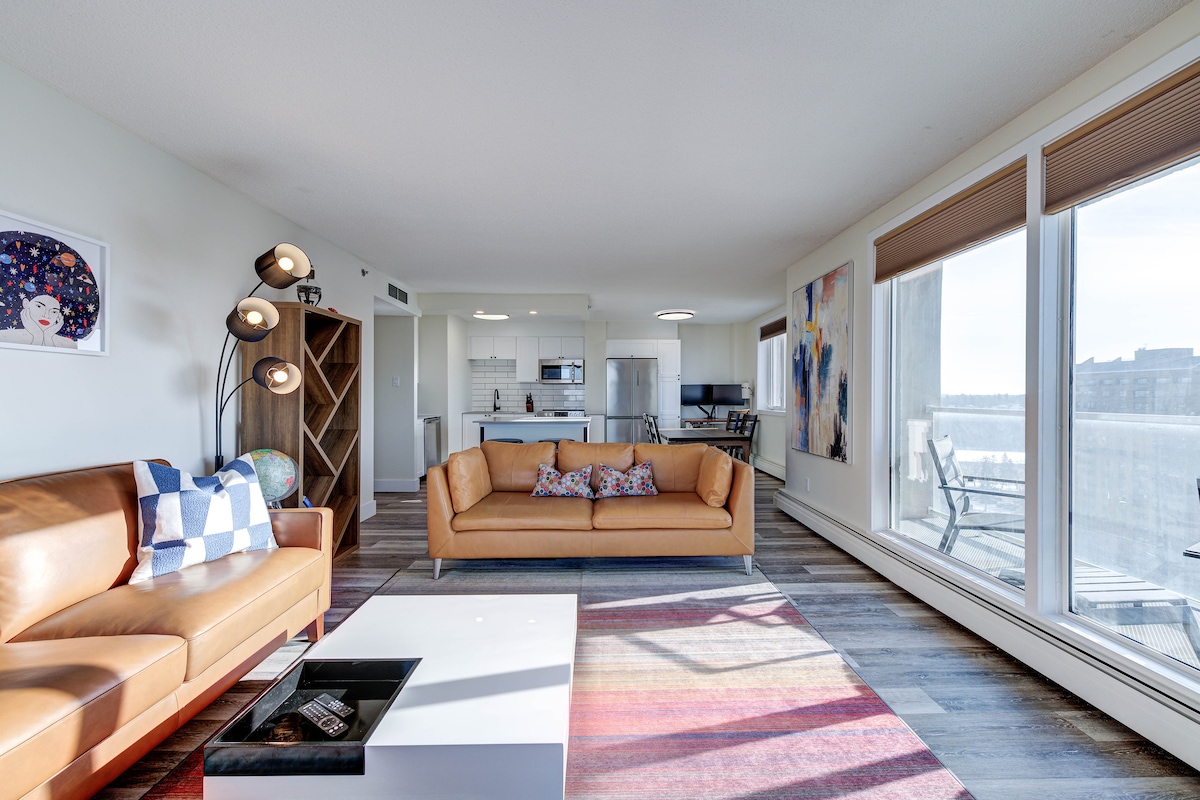 Soar above the city in this stunning 22nd-floor, 2-bedroom penthouse with breathtaking skyline views. Enjoy a massive private rooftop patio with, perfect for 4 guests. Located in the heart of downtown, you're just steps from the river, RUH, and City Hospital. This modern retreat offers a unique urban escape with a fully equipped kitchen and high-speed WiFi, ideal for both business and leisure travelers.