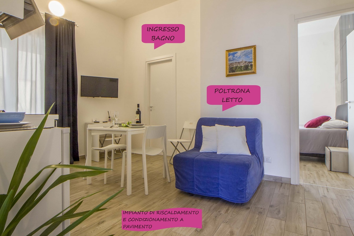 A welcoming apartment ideal for families with children. The apartment is located 400 meters from the Sassi Di Matera. The apartment has a double bed, sofa bed for two people, sofa bed, induction cooker, electric oven, refrigerator, air conditioner, washing machine portable. Air conditioner euro 15 per day. The portable washing machine costs €10 per stay. Electric heating costs €5 per day. Includes Wi-Fi, Netflix, Amazon Prime and a large outdoor garden with gazebo.