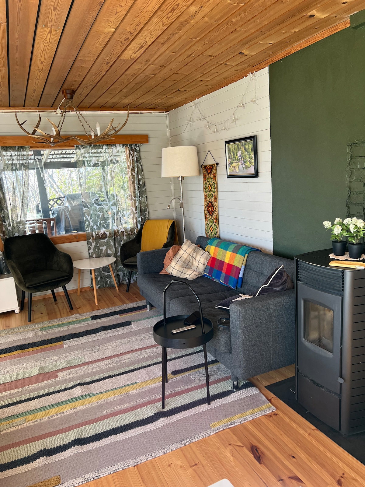 Pond, clean water, sand bottom, amazing Finnish sauna. There is a queen size bed and a sofa which fits two people. There is a seperate entrance to the sauna, which has a shower and bathtub. The sauna is used also by us. We have deer that are kept in a fenced in area.