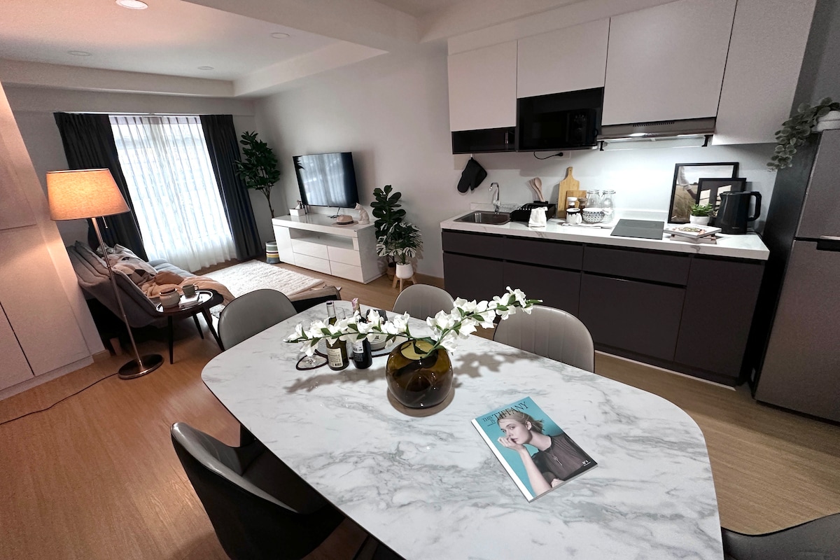 Spacious 62sqm pet-friendly suite, featuring a large balcony! Designed with an open living space that includes a smart TV, working area, 4-seat dining table, and fully equipped kitchen. The bedroom boasts a king-sized bed, another smart TV, powder area, and walk-in closet for your comfort. Both the living and bedroom provide access to the 4-fixture bathroom, which includes a relaxing bathtub and shower.Enjoy amenities such as swimming pool, gym and complimentary shuttle service during your stay!