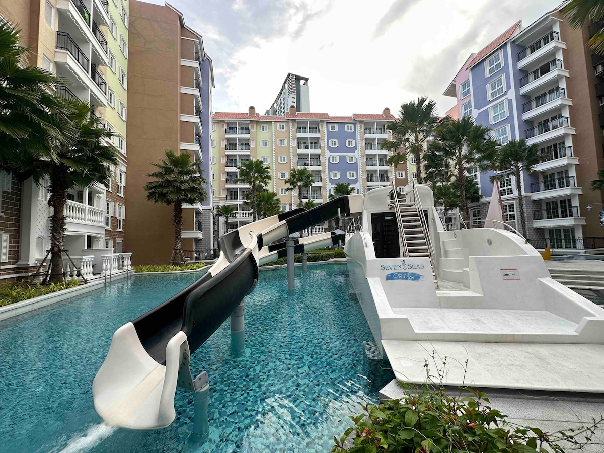 Seven Seas Cote d'Azur is one of the most desirable places in Pattaya area. It consists of 3 gigantic zones of swimming pools - stylish and beautifully designed. With our pool access unit, You will have the convenience of jumping into these breathtaking pools at anytime. Facilities include a big gym, co-working area/library, kids playground, game room, sauna.Furthermore, Jomtien Beach is only a short distance walk. a 7-eleven, rental car/bike shop, Thai massage, restaurant are also on site.