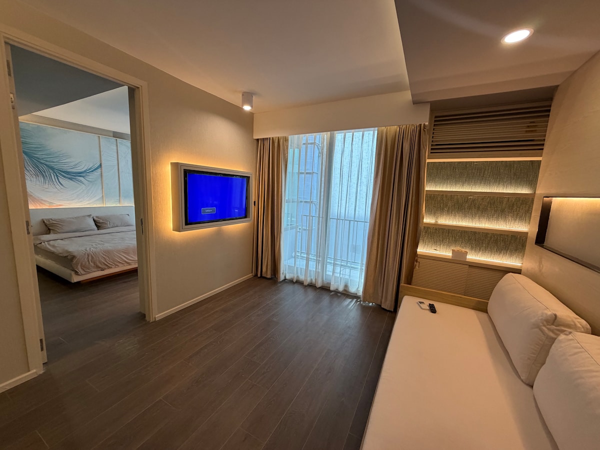 Sea View Condo at Veranda Resort Pattaya – 5-Star Beachfront Stay Welcome to our 35 sqm modern-designed condo in the luxurious Veranda Resort Pattaya, just steps away from Jomtien Beach. Perfect for couples, families, or small groups looking for a peaceful yet stylish getaway. The room features a bright ocean-inspired decor with a comfy King-size bed, sofa bed, air conditioning,TV, hotel-grade linens and towels, a fully equipped kitchenette, a dining table,all set to give you the comfort of home