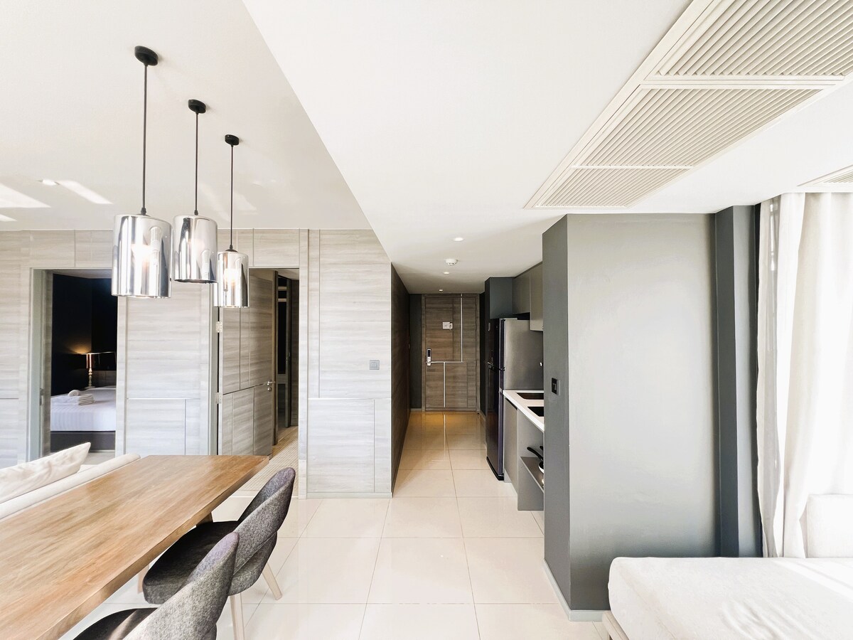 Welcome to your newly renovated 65 sqm beachfront apartment at Avatara Condominium — one of the best locations in Jomtien, only 50 meters from the beach. This spacious and stylish suite features: • Large living room with comfortable seating • Fully equipped kitchen with everything you need • Washing machine for long stays • Smart TV with Netflix • High-speed internet • Big bedroom with a soft, high-quality bed • Two balconies — one from the living room and one from the bedroom