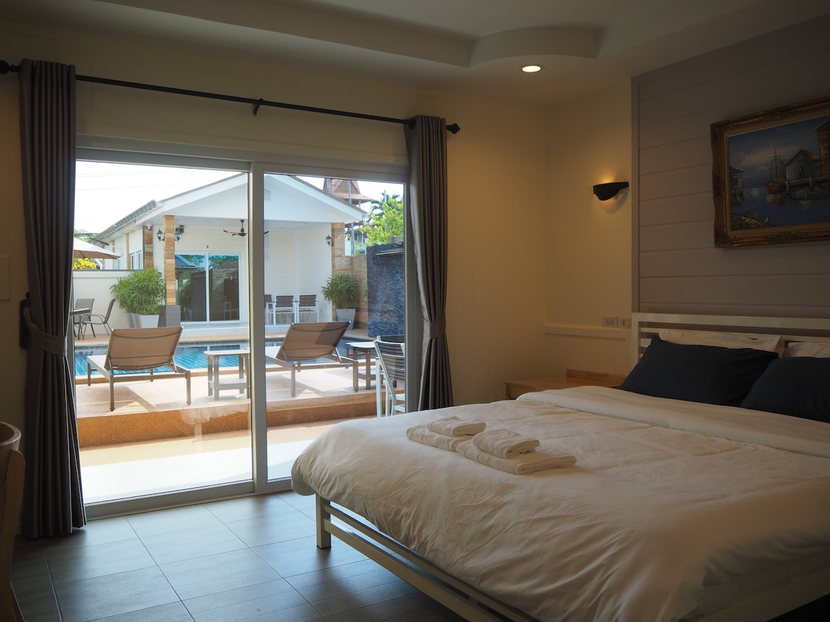 This Luxury 5 beds and 6 baths, is located just 10 minutes from the beach. Perfectly set up for families and groups. 🧽 Free cleaning & linen change during stay ✨ Free Water, Soda, Coffee, Tea 🍴 Fully equipped kitchen & BBQ 🛒 A supermarket in front of the villa entrance 🥬 A fresh local market is a few minutes away 🚖 Airport pick-up service 🏡 Guest Notes 🔑 Self Check-In 🔌 Electricity usage is charged at 8THB/unit (first 50 units are free) 💰 Refundable security deposit:5,000THB