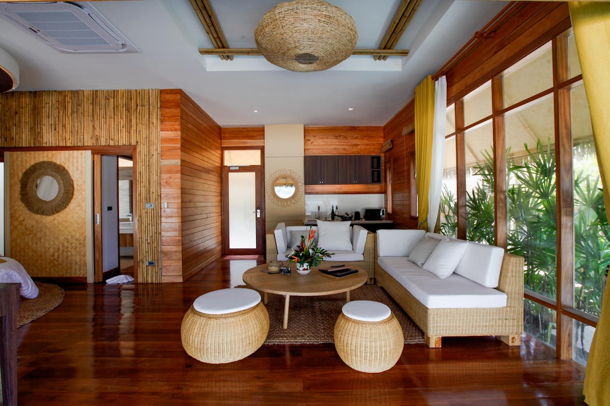 Deluxe suite sea view, Front with panoramic view of Sky and Sea. The room is located on ground floor, 42 square meter with a spectacular sea view and a serene stylish space, "Deluxe suite sea view" was designed to catch sea wind flows through its room encourages guests to feel the breath of Lipe. The room offers an air-conditioned with a separate living area. **Breakfast included